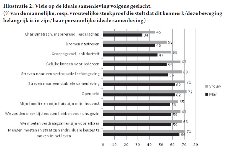 Het is een onderschat thema dat wellicht al te vaak door een normatieve politieke correctheid onder tafel wordt geveegd, maar mannen en vrouwen appreciëren de samenleving op een complementaire manier en leggen merkelijk andere accenten (Illustratie 2). Als de sociaaldemocratie in de toekomst een kans wil maken, zal men voor dit gegeven een oplossing moeten vinden. Wat relevant is voor mannen is dat niet altijd voor vrouwen en omgekeerd. De combinatie van sociaal ingesteld zijn met het appreciëren van een vertrouwde omgeving is duidelijk meer vrouwelijk. Hier ligt zeker een belangrijke sleutelcombinatie.