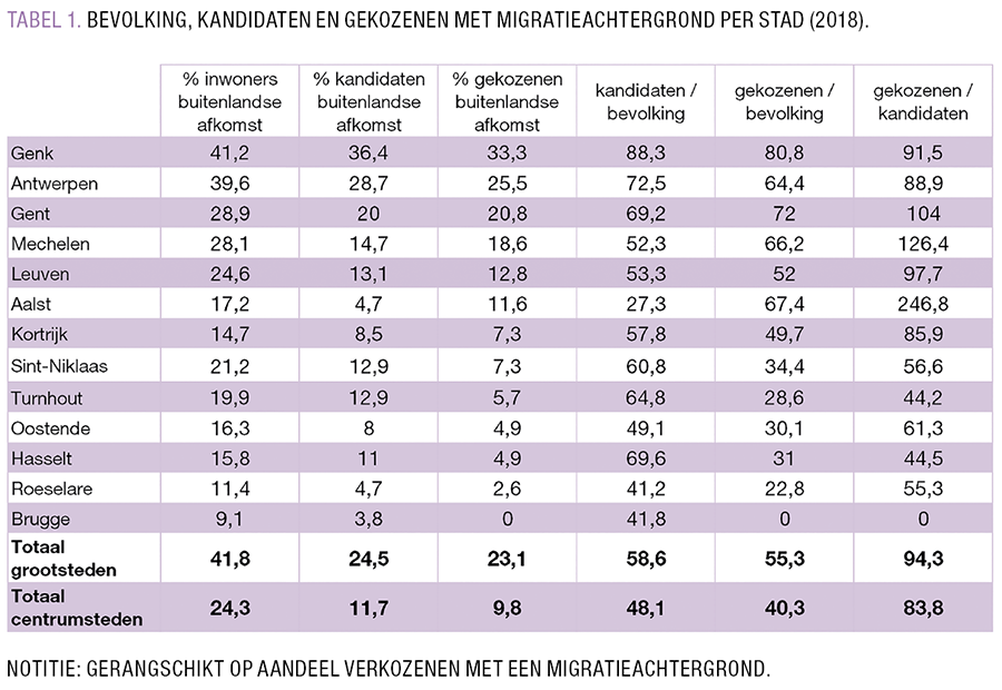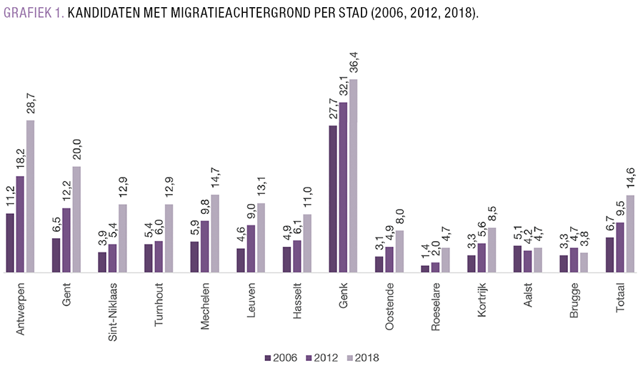 Het percentage kandidaten met een migratieachtergrond in de Vlaamse groot- en centrumsteden bedraagt 14,6%. Dit is een sterke stijging tegenover 2012 (9,5%). De meest diverse steden tellen ook het grootste aantal etnische kandidaten en gekozenen. Linkse partijen scoren beduidend beter dan rechtse partijen. Kandidaten met migratieachtergrond bekleden vooral middenposities op de kieslijsten. Dit verkleint hun kansen om verkozen te geraken, hoewel ze vaak dankzij voorkeurstemmen over anderen heen 'springen' en zo toch verkozen raken. Het aandeel gemeenteraadsleden met een migratieachtergrond ligt op die manier toch in de buurt van het percentage kandidaten met 12,4%. Maar burgers met een migratieachtergrond zijn nog altijd ondervertegenwoordigd in de lokale politiek ten opzichte van hun aandeel in de bevolking.