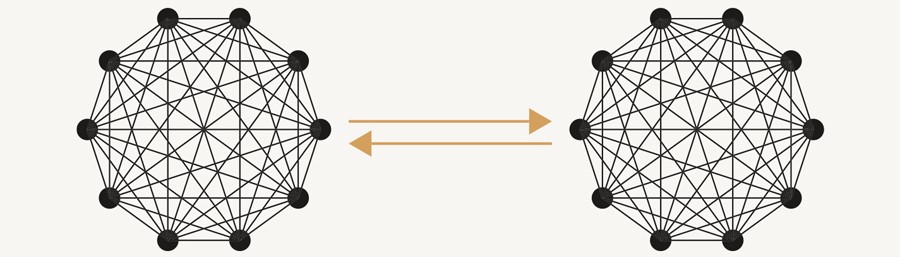 Het is niet mijn bedoeling om diep in de wiskundige details te duiken en daarom gebruik ik een zo concreet mogelijk voorbeeld. Laat de groep X samengesteld zijn uit 100 mensen. Met x(i) bedoel ik niets anders dan de i-de persoon in de groep zodat de samenstelling van de groep als volgt kan worden voorgesteld: x(1), x(2), …, x(99), x(100). Als een persoon x(i) informatie kan doorgeven aan persoon x(j) dan is er een link van x(i) naar x(j) of, in half wiskundige notatie, x(i) --> x(j). Wat we verstaan onder de structuur van de groep X is een lijst van linken, anders gezegd, wie heeft met wie contact. En wat blijkt? Er zijn heel wat structuren denkbaar. Ik geef twee eenvoudige voorbeelden.