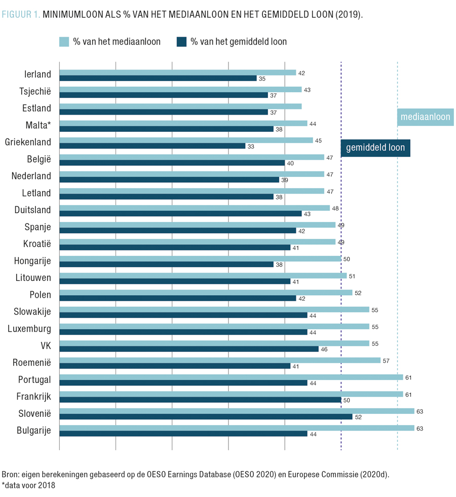 Laat ons dit concreet invullen. Wat kan de minimale ondergrens voor een eerlijk minimumloon zijn? De waarde van een minimumloon wordt in belangrijke mate bepaald door haar verhouding tot de rest van de lonen. De toets die daarbij gebruikt kan worden, is het mediaanloon (dat wat in de midden van de loonverdeling ligt) of het gemiddelde loon.4 FIGUUR 1 geeft de verhouding van de minimumlonen weer ten opzichte van het mediaanloon en het gemiddeld loon. In België is het minimumloon gelijk aan 40% van een gemiddeld loon en 47% van het mediaanloon. De relatieve waarde van een minimumloon verandert de discussie volledig.