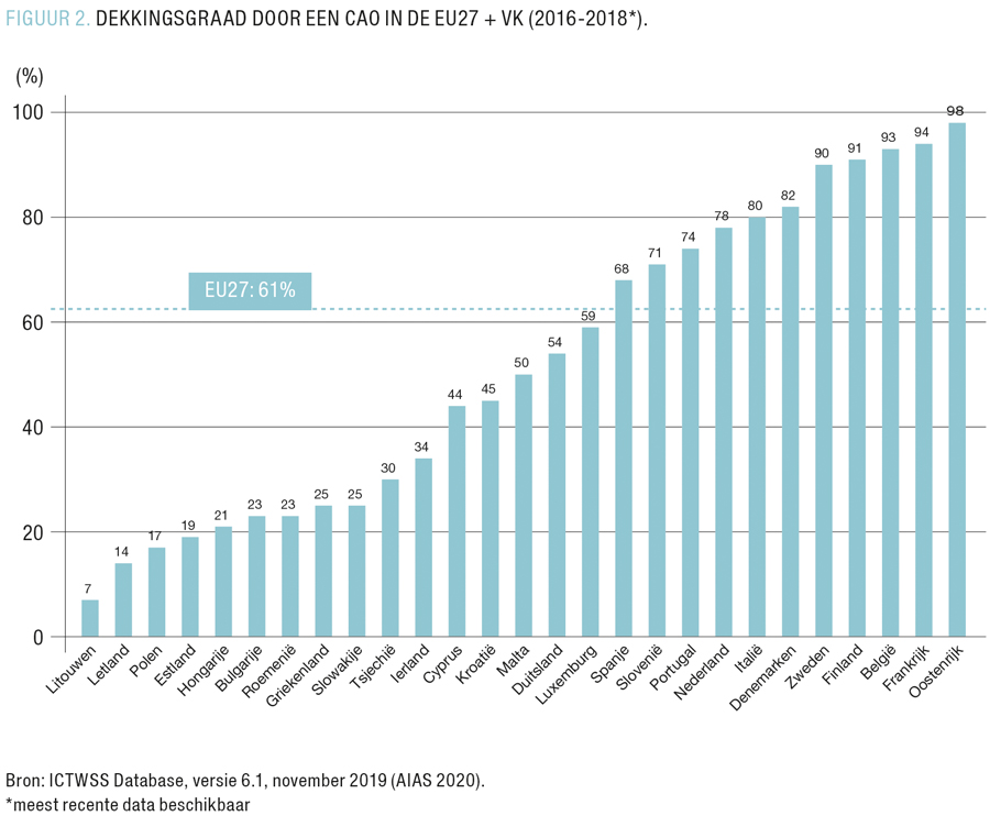 Wat bovenstaande discussie bovendien duidelijk maakt, is dat we ons niet mogen blindstaren op enkel hogere minimumlonen of een Europees minimumloon. Goede minimumlonen vormen een belangrijk onderdeel van een pakket aan arbeidsmarktinstituties die mensen een waardig inkomen garanderen. Maar vergeet het belangrijkste niet: een hogere levensstandaard voor werknemers kan je enkel afdwingen door een sterk systeem van collectieve onderhandelingen op poten te zetten. Wat ben je met een minimumloon wanneer werknemers niet in staat zijn om daarnaast degelijke lonen te onderhandelen of de werkbaarheid van een job te garanderen via een cao? Niets. En dat is het geval in erg veel landen (FIGUUR 2). Neem de landen waar we het eerder over hadden. In Bulgarije en Roemenië is minder dan een kwart van de werknemers gedekt door een cao. Veel landen uit het voormalig Oostblok zijn er nog slechter aan toe. Niet gedekt betekent: de werknemer is volledig afhankelijk van de grillen en goodwill van een werkgever.
