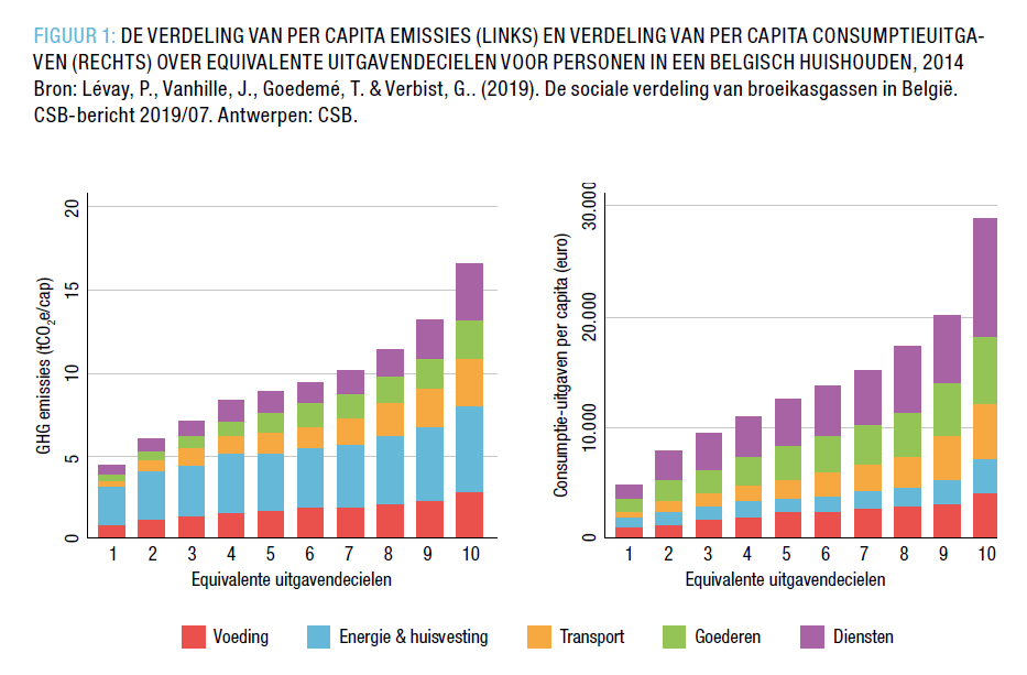 Binnen een land als België zijn de verhoudingen uiteraard minder extreem, maar ook hier houdt inkomenspositie het sterkste verband met de huishoudelijke koolstofvoetafdruk (FIGUUR 1). Gemiddeld schatten we deze bij de armste 10% huishoudens (hier geoperationaliseerd als de minst bestedende huishoudens) ongeveer vier keer kleiner dan bij de 10% rijkste (meest bestedende) Belgische huishoudens. Opgedeeld naar haar ruwe componenten zoals voeding, energie & huisvesting, transport, goederen en diensten, wordt de rol van de sociale gradiënt duidelijker. Waar bij quasi iedereen een aanzienlijke 'basis' uitstoot gepaard gaat met voeding en energieverbruik in de woning (beide weliswaar toenemend met levensstandaard), vormt dit voor groepen aan de onderkant van de inkomensverdeling de grootste hap van hun totale emissies. Bij rijkere groepen stijgen vooral de componenten die daar bovenop komen: transport (voornamelijk autogebruik, omdat we vliegreizen niet goed konden capteren), voeding en consumptie van goederen en diensten.