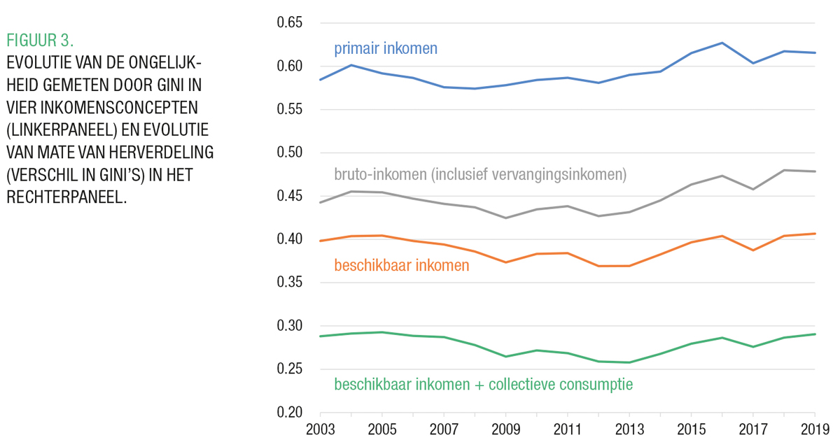 In FIGUUR 3 tonen we in het linkerpaneel (bovenste beeld), voor dezelfde bevolking van 20 jaar en ouder, de evolutie van de Gini-coëfficiënt van 2003 tot 2019 voor die vier verschillende inkomensconcepten. Het patroon is consistent: er is een duidelijke omslag in de evolutie van de ongelijkheid vanaf ongeveer 2013. In die periode stopt het dalend verloop en begint de ongelijkheid toe te nemen. Dat geldt, zoals hierboven al vastgesteld zowel voor het primair inkomen als voor het beschikbaar inkomen, maar dus evenzeer voor het inkomen waarin rekening wordt gehouden met het afwezige (of heel beperkte) primair inkomen van gepensioneerden, en zelfs voor het beschikbaar inkomen dat uitgebreid werd met de collectieve uitgaven (de groene lijn).