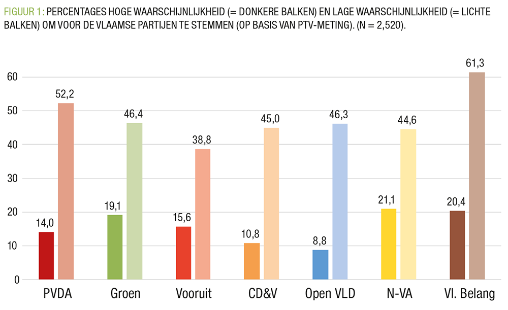 Dit is de zogenaamde ‘propensity to vote’ (of PTV) meting, wat een andere soort vraagstelling is dan een directe vraag naar de kiesintentie die bevraagt op welke partij men zou stemmen als er morgen verkiezingen zijn. Bij de PTV-meting worden alle deelnemers gevraagd om voor elke partij aan te geven hoe waarschijnlijk het is dat ze ooit op een bepaalde partij zullen stemmen. Deze vraagstelling heeft twee voordelen ten opzichte van de klassieke stemvoorkeur vraag: we kunnen enerzijds zien wie een uitgesproken voorkeur heeft voor een partij maar er misschien niet op zal stemmen. Anderzijds kunnen we ook zien wie een uitgesproken aversie heeft tegen een partij en er dus allicht nooit op zal stemmen. Die aversie is niet of nauwelijks van belang voor de verkiezingsuitslag, maar zegt wel iets over de kans dat partijen bereid zullen zijn met elkaar in een coalitie te stappen.