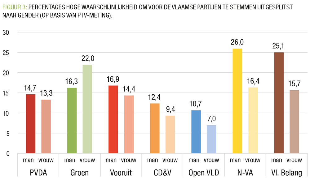 FIGUUR 3 laat de genderkloven zien in de neiging om voor een bepaalde politieke partij te stemmen. We vinden enkel significante verschillen tussen mannen en vrouwen voor de partijen Groen, N-VA en Vlaams Belang. Vrouwen geven vaker aan waarschijnlijk te gaan stemmen voor Groen, terwijl mannen significant vaker aangeven met grote waarschijnlijkheid te stemmen voor N-VA en Vlaams Belang.