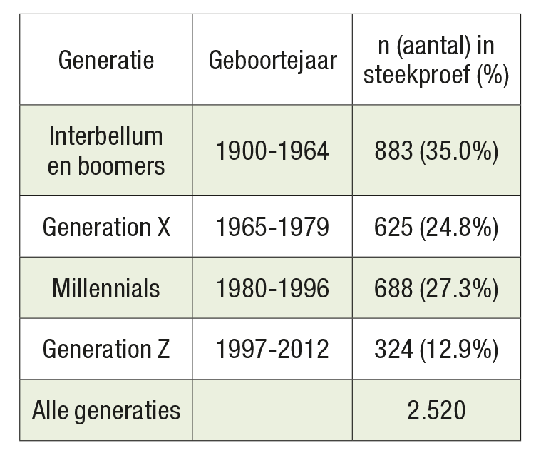 In volgende stappen bekijken we of er systematische verschillen zijn tussen de stemneiging enerzijds voor de verschillende generaties en anderzijds tussen mannen en vrouwen. We besteden daarbij extra aandacht aan een mogelijke genderkloof tussen verschillende generaties voor uitgesproken rechtse en linkse steun, uitgedrukt in partijvoorkeur. We onderscheiden vier grote generaties op basis van het geboortejaar (TABEL 1).
