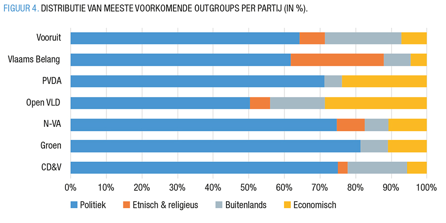 Open VLD laat de laagste proportie outgroups naar de categorie 'politieke tegenstanders' optekenen, en lijkt de rol van verzoener of leider in de regering op te nemen.