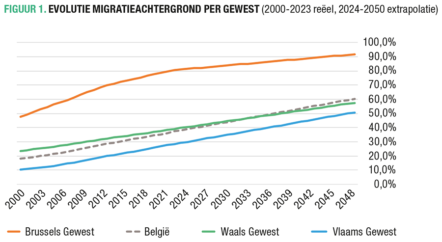 Tegen 2050 heeft 50% van de inwoners van het Vlaams Gewest een migratieachtergrond, in het Waalse Gewest is dat 60%, in Brussel 90%, alles samen in België 61% (FIGUUR 1).
