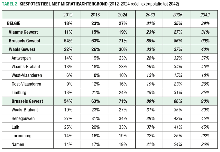 De berekening van het kiespotentieel met migratieachtergrond voor 2024 wordt nu toegepast op de deelname aan de verkiezingen in 2012 en 2018.2 Zo kan een lineaire extrapolatie worden gemaakt van de deelname aan de komende verkiezingen in 2030, 2036 en 2042 (TABEL 2). Enkel partijen die anticiperen op deze transformatie van de bevolking zullen hun zeggingskracht behouden of vergroten.