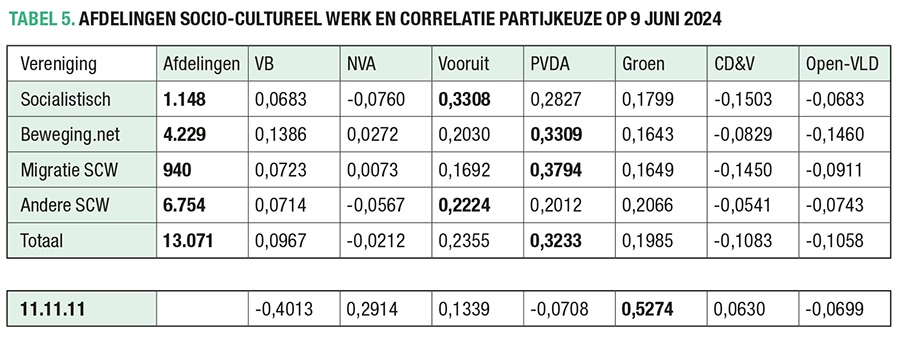 Als we nagaan wat de correlatie is van de 52 erkende socio-culturele organisaties en de spreiding van hun 13.072 afdelingen in de gemeenten met de scores van de partijen, mogen we ons opmaken voor een wonderlijke ontdekking. In TABEL 5 vindt u de correlaties van de diverse groepen en organisaties, en de partijuitslagen in het Vlaams Gewest (voor Brussel en Wallonië zijn geen data samengebracht). In TABEL 5 wordt ook berekend hoeveel inwoners er wonen per socio-culturele afdeling. Veel organisaties maken deel uit van grotere bewegingen zoals beweging.net, de socialistische of liberale ‘familie’, de ecologisch georiënteerde initiatieven en zelforganisaties van ouderen of migratie. De zes verenigingen van beweging.net zijn gemakkelijk samen te brengen, net als de christelijke landelijke organisaties en de organisaties van socialistische huize. Van de anderen worden er enkele exemplarisch vermeld. In de tweede kolom wordt het aantal afdelingen opgegeven.
