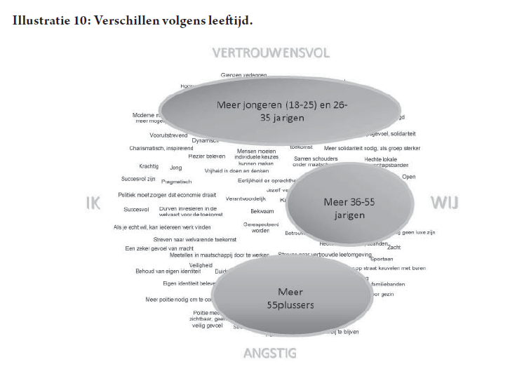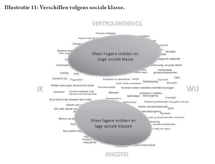 In Illustratie 8 herkennen we van onder naar boven de as: vertrouwen versus angst. Dit bevat de tegenstelling: wijds wereldbeeld versus wereldbeeld beperkt tot eigen thuis en gezin. Van links naar rechts gaan we van een egocentrale maatschappij visie (‘ik’ gericht) naar een meer collectieve appreciatie van de samenleving (‘wij’ gericht).
