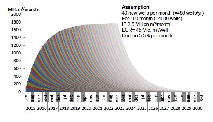 Figuur 2: Aantal boorputten nodig voor de productie van 20 miljard m³ schaliegas voor tien jaar.