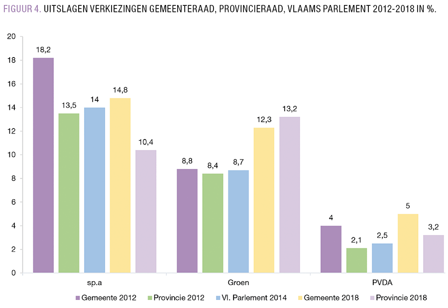Een vergelijking tussen 2012 en 2018 maakt duidelijk dat sp.a ook op het provinciaal niveau terrein verliest. Bij de groenen liggen de scores van beide verkiezingen zowel in 2012 als in 2018 dicht bij elkaar. Net als bij de gemeenteraadsverkiezingen gaan de groenen er op het provinciale niveau op vooruit.