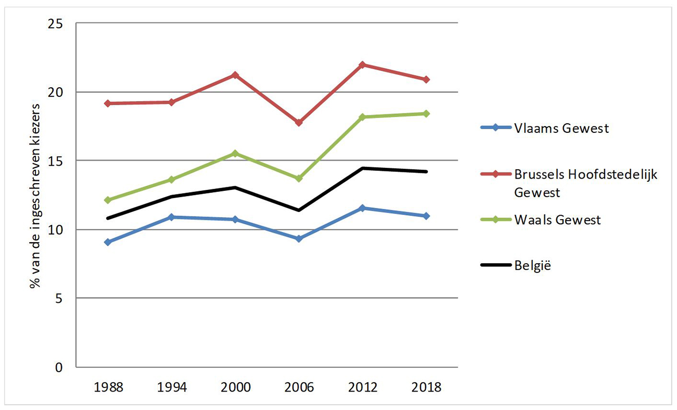 Figuur 2 geeft het aandeel volwassenen dat niet stemde bij de gemeenteraadsverkiezingen in de voorbije 30 jaar. Hier gaat het wel om het hoogste cijfer in de laatste 30 jaar, ook al is het stemrecht in de loop van de jaren uitgebreid (in 2000 naar de EU-burgers en in 2006 naar de niet-EU-burgers). De inschrijvingsgraad onder hen is immers laag, en het aantal niet-Belgen stijgt. Bovendien toonden we eerder aan dat er ten opzichte van de meeste jaren ook een stijgende niet-deelname is bij de ingeschreven kiezers. De enige uitzondering op de figuur is het Brussels Hoofdstedelijk Gewest, waar de niet-deelname (net) iets lager ligt dan bij de vorige verkiezingen, omdat het aandeel inschrijvingen onder de niet-Belgen er beduidend hoger was dan in de voorgaande jaren, en er relatief ook de grootste stijging was van de participatie onder de ingeschreven kiezers.