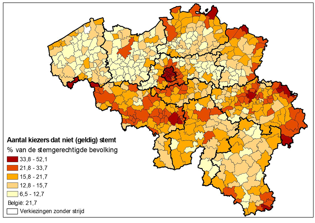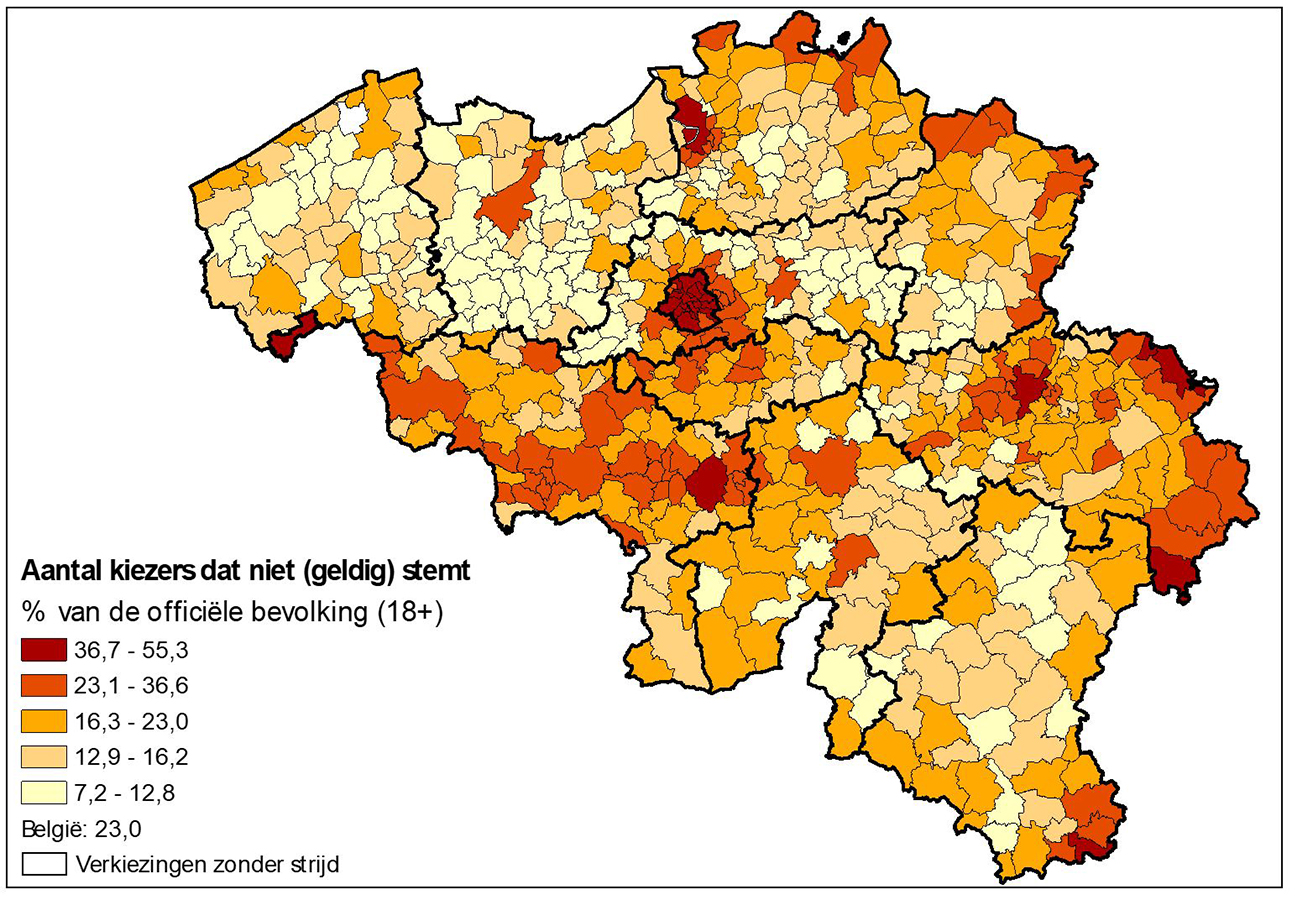 Bij de gemeenteraadsverkiezingen van 2018 brachten meer dan 1 miljoen ingeschreven kiezers geen stem uit, en dat geldt voor bijna 2 miljoen stemgerechtigde kiezers (dus ook niet-Belgen die zich niet inschreven). Als de gehele bevolking op stemgerechtigde leeftijd wordt bekeken (dus ook personen zonder stemrecht) is dat nog meer: dan gaat het om 23% van de volwassen bevolking. Dat is het hoogste cijfer in de laatste 30 jaar. Op gewestelijk en zeker op gemeentelijk niveau kunnen de cijfers nog veel hoger zijn, vooral in stedelijke gebieden: tot meer dan een derde van de ingeschreven kiezers en meer dan de helft van de stemgerechtigde bevolking.