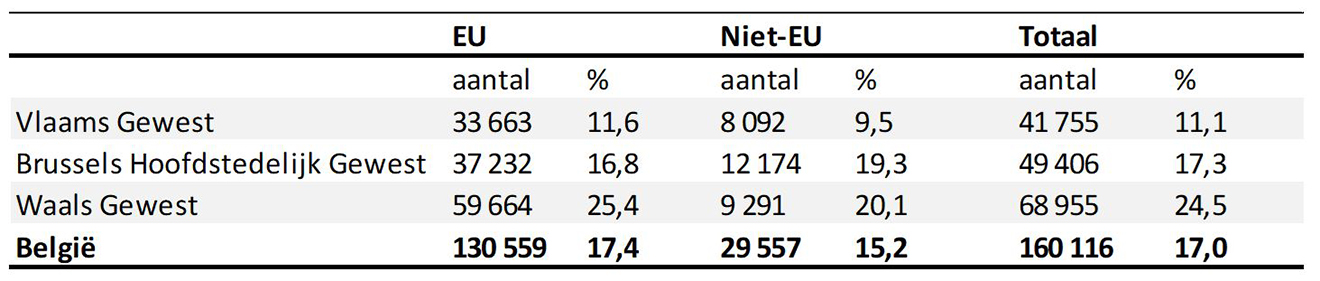 7. In absolute termen daalde het aantal inschrijvingen voor EU-burgers wel licht in Wallonië, zowel in 2012 als in 2018, maar de stijging van de niet-EU-burgers was er groter. In relatieve termen was er in 2012 een algemene daling in alle gewesten, zowel voor EU-burgers als niet-EU-burgers. Die zet zich in 2018 door in Vlaanderen, maar dus niet in Brussel en slechts gedeeltelijk in Wallonië, waar het cijfer voor de niet-EU-burgers nu hoger ligt dan in 2012, maar lager dan in 2006. Hetzelfde geldt voor heel België.