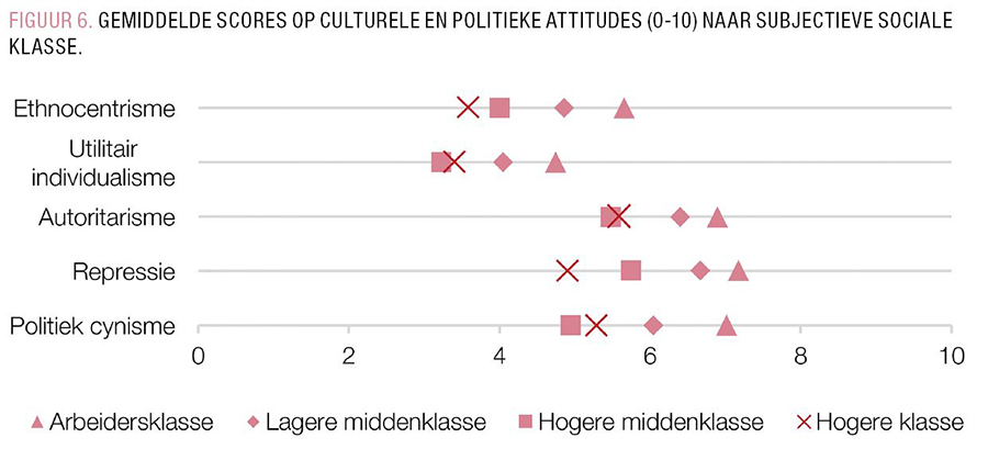 Ten tweede blijkt dat culturele thema's de verschillende sociale klassen meer verdelen dan sociaaleconomische thema's. Er zijn relatief kleine verschillen tussen arbeidersklasse en beide segmenten van de middenklasse als het gaat over de houding ten aanzien van arbeidsethiek, sociale herverdeling, de vrijmaking van de markt of de vakbonden (Figuur 5). Op de culturele en politieke breuklijn (Figuur 6) is er echter beduidend meer verdeeldheid. De arbeidersklasse wordt gekenmerkt door een uitgesproken etnocentrisme, autoritarisme, recht-en-orde denken en politiek cynisme: het politieke establishment wordt verweten wereldvreemd en hypocriet te zijn, en de multiculturele samenleving en afwijkend gedrag worden krachtdadig afgekeurd. De arbeidersklasse heeft een grotere kans om een cynische minachting ten aanzien van de politiek te koppelen aan een radicaal autoritair en etnocentrische wereldbeeld. Relevanter is echter dat ook de lage middenklasse heel wat moeite heeft met de globaliserende, individualiserende en permissievere samenleving. Onze resultaten geven aan dat de lagere middenklasse een tussenpositie inneemt, waarbij het de lagere middenklasse zelfs eerder lijkt aan te sluiten bij het ideologische profiel van de arbeidersklasse dan dat van de hoge middenklasse. In het algemeen mondt de bezorgde kwetsbaarheid van de lage middenklasse niet zozeer in een rabiate verwerping van de sociale veranderingen, maar wel in een sceptische houding ten aanzien van het huidige politieke bedrijf en de multiculturele samenleving. Ook lage middenklassers hebben de indruk dat vreemdelingen en afwijkende Anderen een buitensporige druk leggen op de publieke orde, dat ze te weinig moeite doen om zich aan te passen aan de gevestigde normen en waarden en dat ze te weinig bijdragen aan de sociale zekerheid, terwijl hun kritiek zich tevens richt op de politiek die dit zomaar laat gebeuren én te weinig de waarden en belangen van correcte en hardwerkende middenklasse zou behartigen.