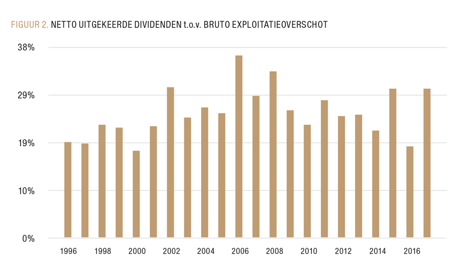 Het beeld is genuanceerd en vooral afhankelijk van het tijdsframe. In aanloop naar het losbarsten van de financiële crisis (2007-2008) steeg het deel van het bruto-exploitatieoverschot dat naar de aandeelhouders ging, opmerkelijk sterk. Daar waar in 1996 en 1997 nog geen 20% van het exploitatieoverschot uitgekeerd werd als dividenden, steeg dit cijfer binnen één decennium met meer dan 10% (FIGUUR 2). Vlak voor de financiële meltdown ging meer dan 35% van het exploitatieoverschot richting aandeelhouders, een historisch record.