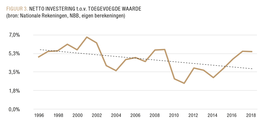 Waar niet omheen kan worden gegaan, is dat ondanks de stijgende marges voor bedrijven er de laatste 23 jaar niet meer middelen naar investeringen gingen. Opvallend is de periode 2001-2007: de evolutie van de uitgekeerde dividenden was omgekeerd evenredig aan de investeringsquote. De dividenden namen een vlucht, de investeringen daalden sterk. Tussen 2009 en 2015 bleef het aandeel dat naar dividenden ging constant, maar de investeringen daalden. Noteer dat als graadmeter voor investeringen de toegevoegde waarde in z'n geheel wordt genomen, omdat investeringen niet het gevolg zijn van de resultaatverdeling. Een vergelijking van de investeringen ten opzichte van het bruto exploitatieoverschot levert evenwel hetzelfde resultaat op.