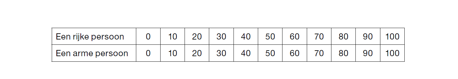 'Deze vraag gaat over inkomstenbelasting. Veronderstel dat een rijke en een arme persoon elk 100 euro hebben en hierop belastingen moeten betalen. Volgens u, hoeveel euro zou ieder van hen aan belastingen moeten betalen op deze 100 euro?'
