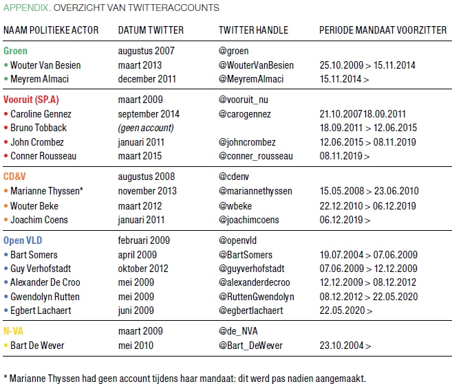 - Dit heeft betrekking op de persoon die op het moment van de tweet de functie van voorzitter bekleedde. Dit wil zeggen dat er de tweets van verschillende partijvoorzitters werden onderzocht. In de appendix is een overzicht opgenomen van de welke accounts werden toegevoegd.↑