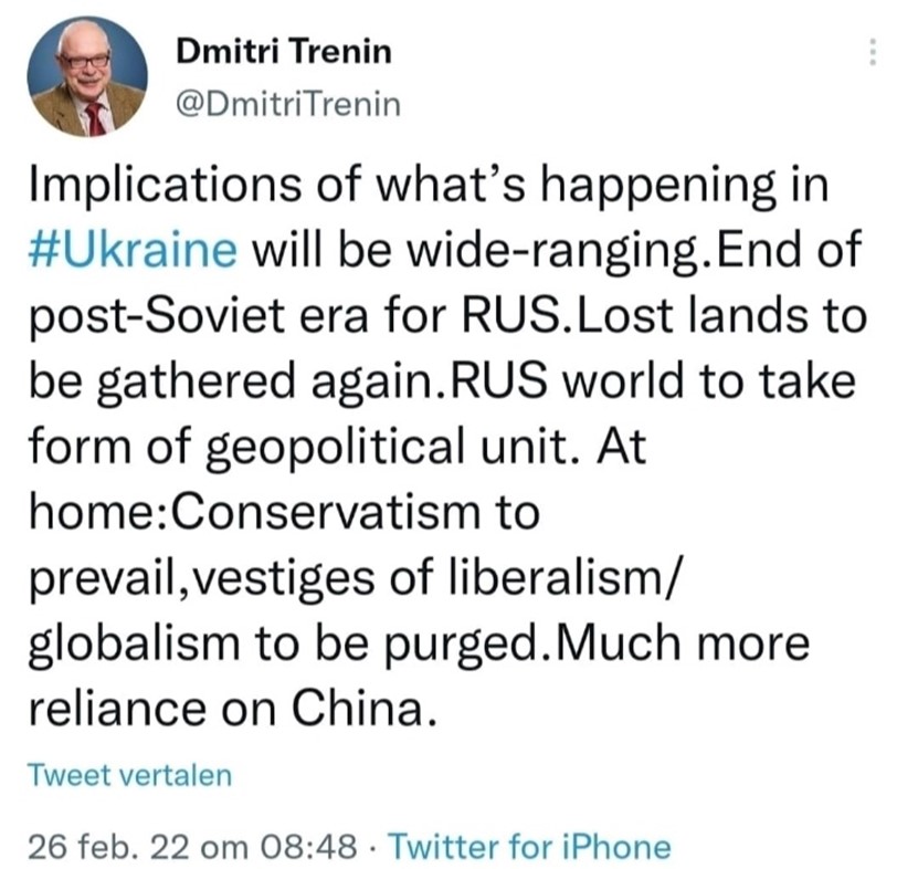 Deze analyse wordt verder ondersteund door een aantal opmerkelijke elementen. Een per ongeluk uitgelekt en voorbereid perscommuniqué van het Russian Information Agency (RIA), dat even online werd geplaatst op 28 februari 2022, kan deze visie bevestigen (AFBEELDING 1). Een eerdere tweet van de Russische buitenlandcommentator Dmitri Trenin ging in dezelfde lijn (AFBEELDING 2). Tegelijk stelde de Russische buitenlandminister Lavrov, op zijn persconferentie tijdens een Turkse bemiddelingspoging in Antalya op 10 maart 2022, dat 'Rusland vecht voor haar plaats in het wereldsysteem'.