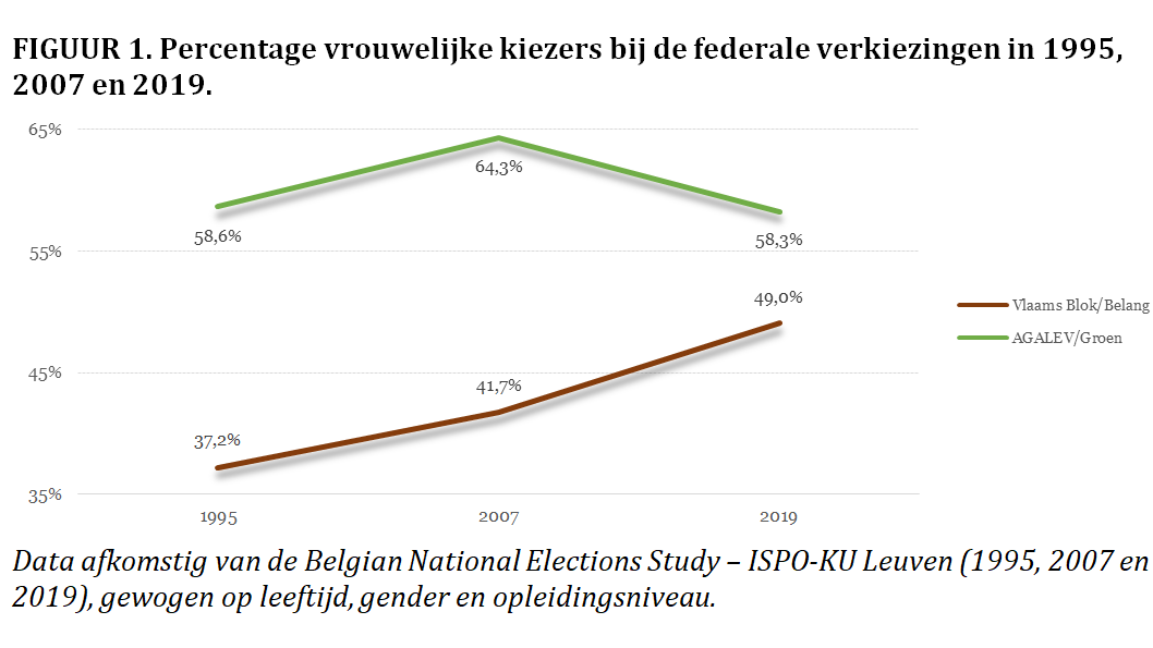 Heeft extreemrechts met die ingrepen de stempel van vrouwonvriendelijkheid afgewassen? Het valt buiten de reikwijdte van deze bijdrage om de oorzakelijkheid daarvan na te gaan. Wat evenwel opvalt is dat Vlaams Belang intussen een electoraat heeft bijeengesprokkeld dat voor 49% uit vrouwen bestaat. Extreemrechts heeft de genderkloof na 30 jaar klaarblijkelijk gedicht; dat terwijl een stem voor culturele antipode Groen wél nog 'gendered' lijkt (FIGUUR 1).