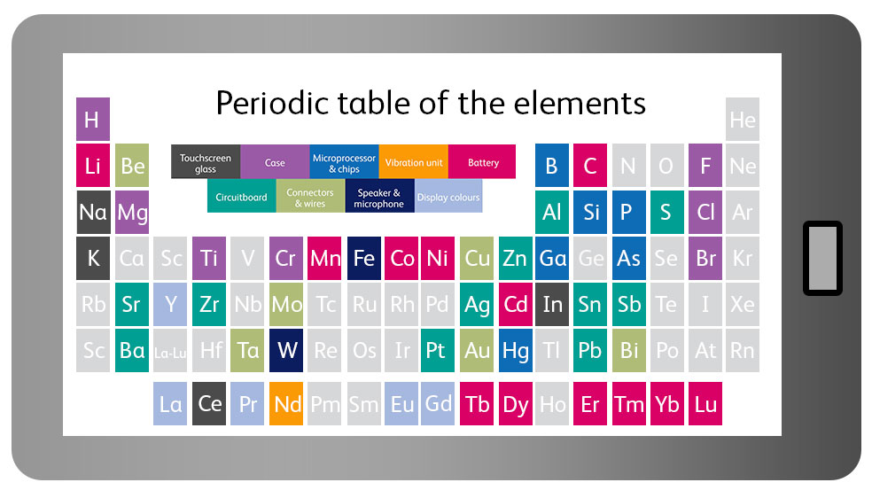 Sommige sectoren kampen nochtans reeds met een bijzonder grimmige situatie wat betreft grondstoffen. Zo is 14% van de materiële voetafdruk (en 16% van de koolstofvoetafdruk) van Belgische huishoudens afkomstig van alleen elektrische producten. Trek die stoffige lades met oude krultangen, vergeelde tablets en 7 generaties iPhones dus maar eens open. Intussen zit er bijna een halve tabel van Mendeljev in onze smartphones, bijzonder mooi weergegeven door het National Museum of Scotland. Metalen en mineralen die allemaal gedolven moeten worden, met een enorme lokale impact op leefmilieu en plattelandsgemeenschappen. There is no such thing as green mining.