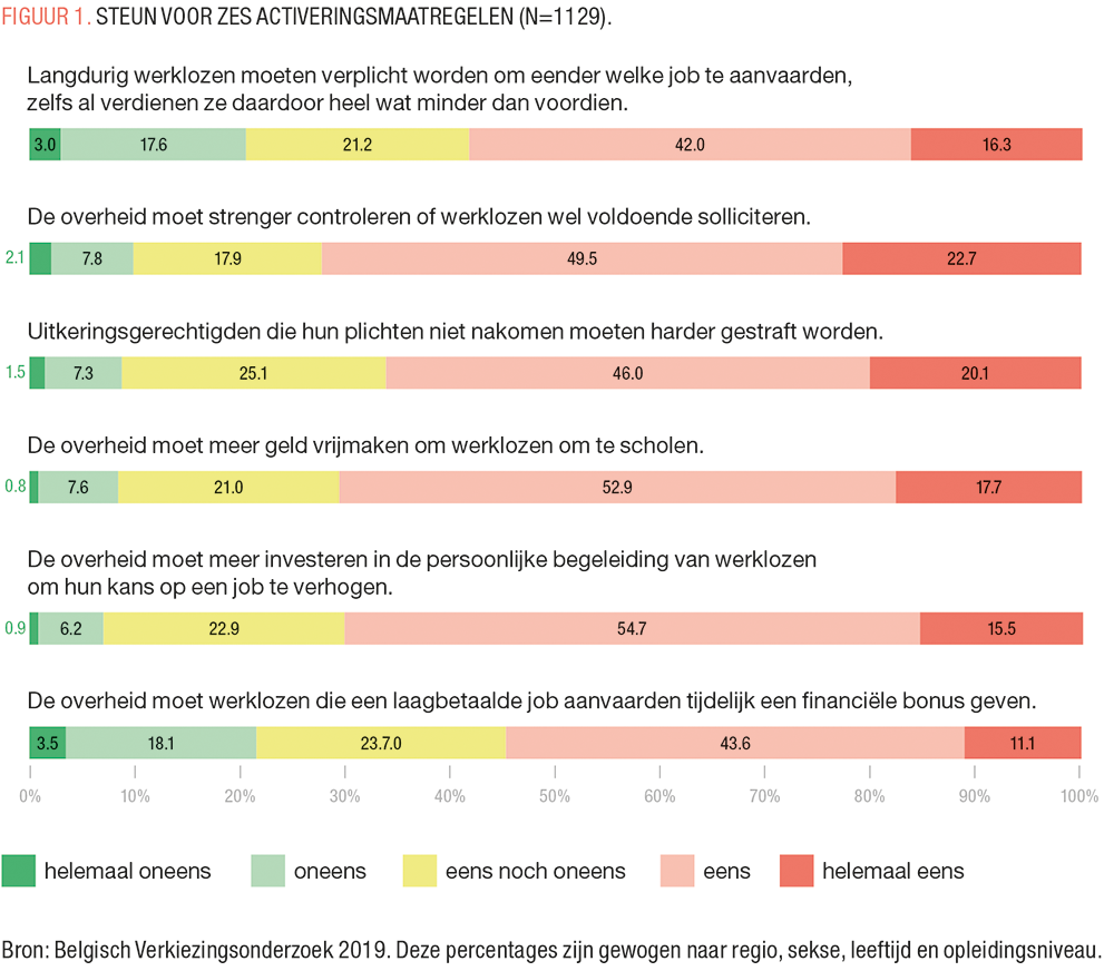 Eerst en vooral valt op dat Belgische burgers in vrij sterke mate voorstander zijn van een disciplinerend activeringsbeleid. Bijna 6 op 10 Belgen is het eens met de stelling dat langdurig werklozen verplicht moeten worden om werkaanbiedingen te aanvaarden, zelfs als dit een loonsverlaging inhoudt in vergelijking met de vorige job. Het idee dat de overheid sollicitatie-inspanningen streng moet controleren en werklozen die verplichtingen niet nakomen moet bestraffen, vindt steun bij 72% respectievelijk 66% van de bevolking. De tegenstand tegen deze disciplinerende activeringsmaatregelen is eerder zwak (respectievelijk 21%, 10% en 9%).