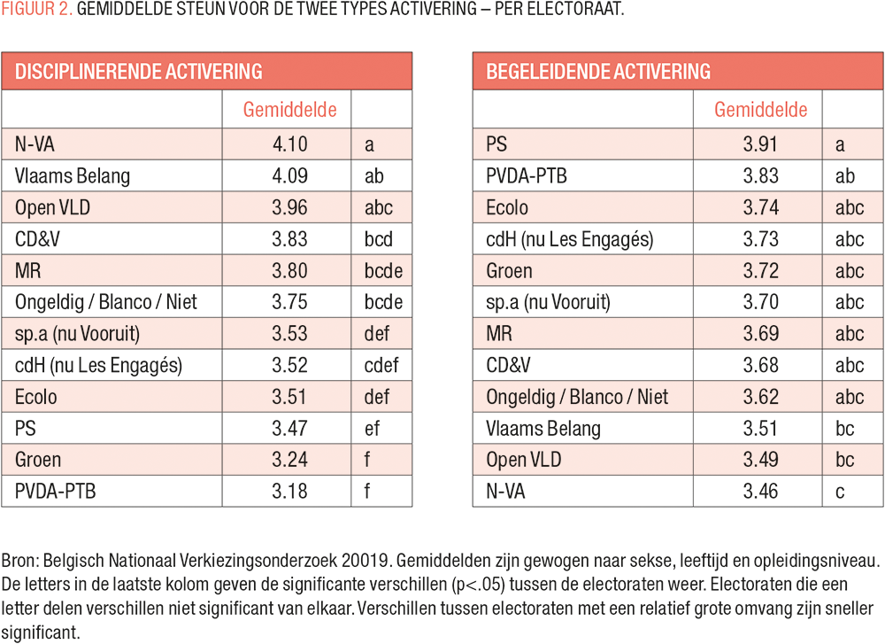 Wanneer we kijken naar steun voor activering per electoraat (TABEL 1), krijgen we een beeld dat consistent is met bovenstaande bevindingen. Wat disciplinerende activering betreft zijn de verschillen erg uitgesproken. Bij kiezers van N-VA en Vlaams Belang is de gemiddelde steun voor dit type activering het hoogst, met een gemiddelde score hoger dan 4 (op een schaal van 1 tot 5). Net daaronder vinden we de electoraten van Open VLD, CD&V en MR. De laagste gemiddelde steun voor disciplinerende activering vinden we aan de andere kant van het politieke spectrum terug, bij Groen en PVDA-PTB. Maar ook ter linkerzijde ligt de gemiddelde score boven het middelpunt van de schaal (3), wat erop wijst dat linkse kiezers disciplineren eerder steunen dan afwijzen. PS, Ecolo, cdH (nu Les Engagés) en sp.a (nu Vooruit) nemen een tussenpositie in. Steun voor disciplinerende activering vertoont dus een duidelijke links-rechts gradiënt. In Vlaanderen is deze gradiënt een stuk steiler dan in Franstalig België. Dit wijst erop dat de harde aanpak van werklozen in Vlaanderen een meer gepolitiseerd thema is.