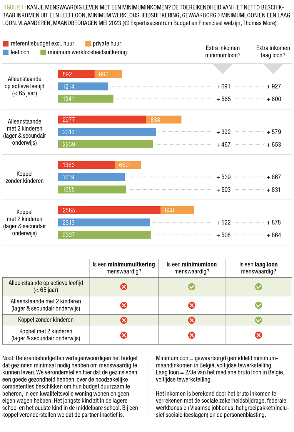 Ook een voltijds inkomen uit een GGMMI of een laag loon is voor heel wat typegezinnen onvoldoende om menswaardig te kunnen leven, zeker wanneer in het gezin een eigen wagen nodig is. Het tekort neemt toe met de aanwezigheid van oudere kinderen in het gezin. Ondanks inspanningen van de federale (werkbonus) en Vlaamse (jobbonus) overheid om het netto inkomen uit lage lonen op te trekken, blijven bijkomende inspanningen noodzakelijk om arbeid tegen een laag loon toereikend te maken, in het bijzonder voor gezinnen met kinderen.