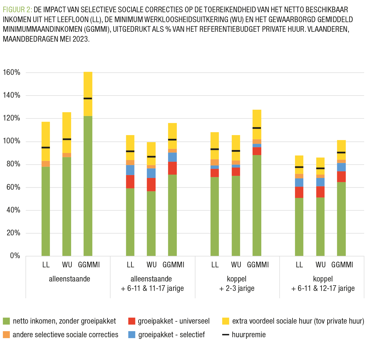 Wat blijkt? Zelfs als we ervan uitgaan dat al deze sociale correcties worden opgenomen door zij die hier recht op hebben, blijft het effect beperkt. Hoewel deze het maandelijks netto beschikbaar inkomen van typegezinnen verhogen met 94 euro (alleenstaande) à 193 euro (koppel met een kind in lager en secundair onderwijs), zorgen ze er bijna nooit voor dat het inkomen toereikend wordt voor gezinnen die een private woning huren.10 Bovendien zijn er vaak grote drempels om het recht op deze sociale correcties daadwerkelijk te kunnen opnemen11 en worden ze versnipperd toegekend. Volgens de recente aanbeveling van de Raad van de Europese Unie moet dit worden voorkomen om solide sociale vangnetten doeltreffend op te zetten en te doen functioneren (Art. 14 in de aanbeveling van de Raad van de Europese Unie, 30/1/2023).