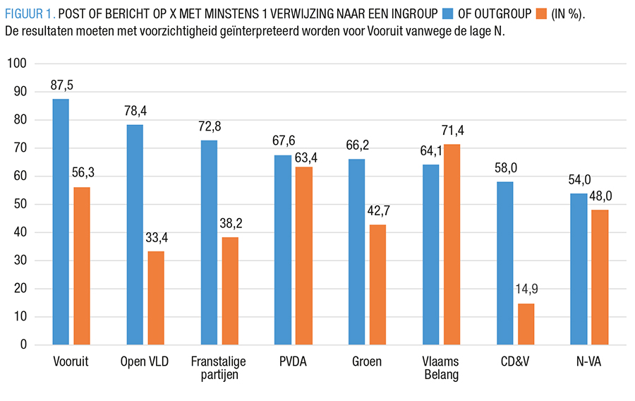 Traditionele partijen zoals CD&V en Open VLD verwijzen veel minder naar outgroups op X, terwijl populistische partijen zoals PVDA en Vlaams Belang bijna even vaak, of zelfs vaker in het geval van Vlaams Belang, verwijzen naar outgroups dan ingroups. Hetzelfde geldt voor N-VA.