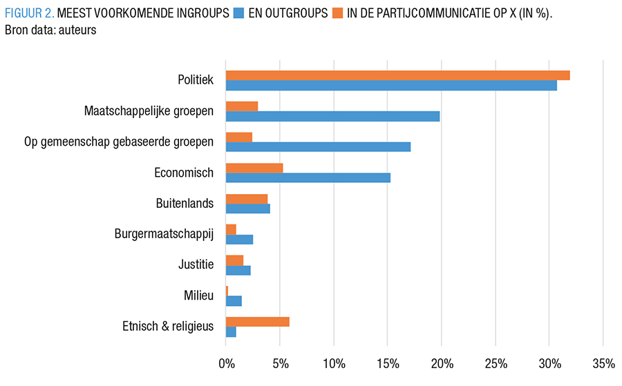 Etnische en religieuze minderheden, vooral migranten, worden vooral vaker als outgroup aangemerkt, bijna uitsluitend in de posts van Vlaams Belang, de meest actieve partij op X.