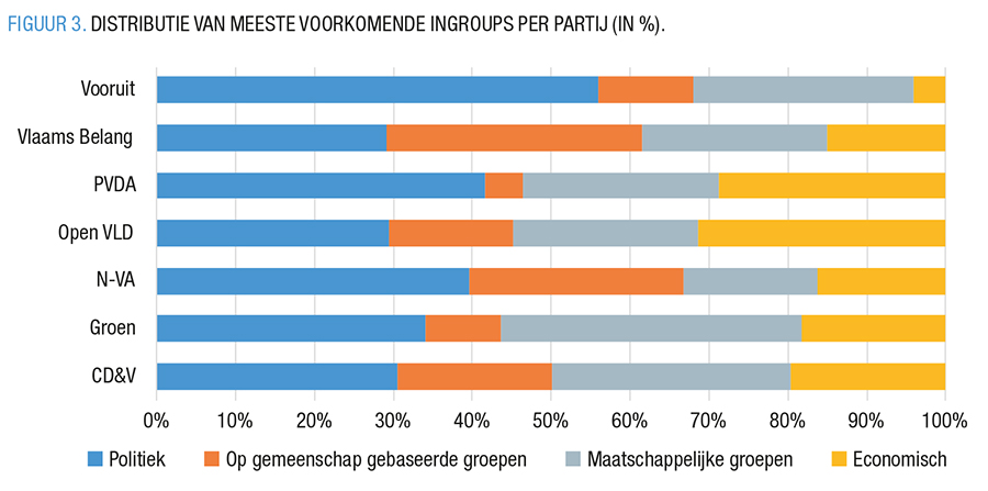 Politieke tegenstanders zijn bijna voor elke partij de belangrijkste outgroup. Open VLD, de partij van premier Alexander De Croo, laat de laagste proportie outgroups naar die categorie optekenen, en lijkt de rol van verzoener of leider in de regering op te nemen; N-VA en Groen benadrukken dan weer vooral de meerderheidspartijen van de regeringen waar ze geen deel van uitmaken (respectievelijke federaal en regionaal) als outgroup, via een meer assertieve communicatiestijl. Verwijzingen naar de eigen gemeenschap (de Vlaamse identiteit) is een belangrijk onderdeel van de communicatie van zowel N-VA als Vlaams Belang, met overlap in de groepen die ze claimen te vertegenwoordigen. Al zijn er subtiele nuances in hun verwijzingen: N-VA spreekt van ‘Vlaanderen’ of ‘Vlamingen’; Vlaams Belang gebruikt de term ‘onze eigen mensen’, ‘ons eigen volk’.