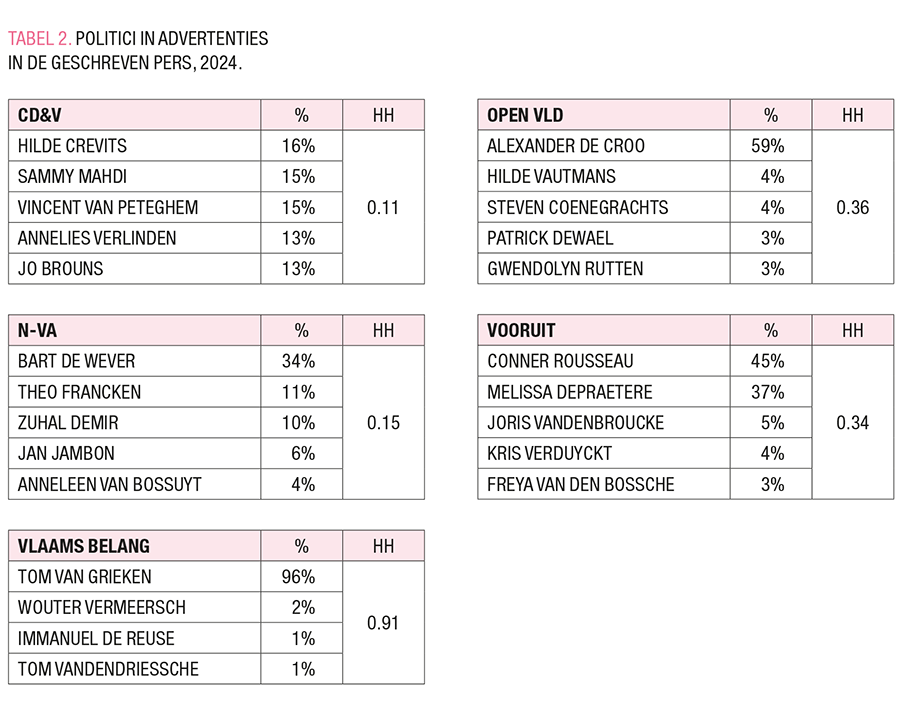 Bij Vlaams Belang is de aandacht het meest ongelijk verdeeld: in essentie was Tom Van Grieken het enige gezicht van de campagne, met als uitzondering één advertentie met drie andere kandidaten. Open VLD voerde een ‘presidentiële’ campagne rond het figuur van Alexander De Croo, op grote afstand gevolgd door de Europese lijsttrekker (Hilde Vautmans), lijsttrekkers in Vlaams Brabant (Steven Coenegrachts en Patrick Dewael) die in de Limburgse edities van kranten een bijkomende reeks advertenties plaatsten, en Gwendolyn Rutten die in Vlaams Brabant ook bijkomende advertenties had. Bij Vooruit waren het Conner Rousseau en Melissa Depraetere die vaak samen werden uitgespeeld in de campagne, met een beperkt aantal andere kandidaten.