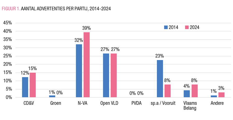 FIGUUR 1 geeft het antwoord op die vraag: vooral N-VA, Open VLD en CD&V plaatsen veel advertenties, Vooruit (vroeger sp.a) en Vlaams Belang een stuk minder, en Groen en PVDA laten dit soort advertenties bijna volledig links liggen. Groen had zowel in 2014 als 2024 wel enkele advertenties, maar zeer beperkt – en vaak beperkt tot edities die ook in het Brussels Hoofdstedelijk Gewest verspreid worden. De daling bij Vooruit is opvallend: bij de andere partijen blijft het aantal advertenties constant, maar bij Vooruit is het aantal advertenties met ongeveer twee derde gedaald tegenover 2014 – wat mogelijk wijst op een verschuiving van het advertentiebudget naar sociale media. Bij Vlaams Belang ligt het lagere aantal advertenties vermoedelijk aan het feit dat hun advertenties niet door alle kranten aanvaard worden, wat in het verleden reeds gebeurde (Voorhoof, 2008). Bij de andere partijen zien we in 2014 Lijst Dedecker en in 2024 Voor U dat – gezien het uiteindelijk geringe electorale gewicht – vrij veel advertenties plaatsten.