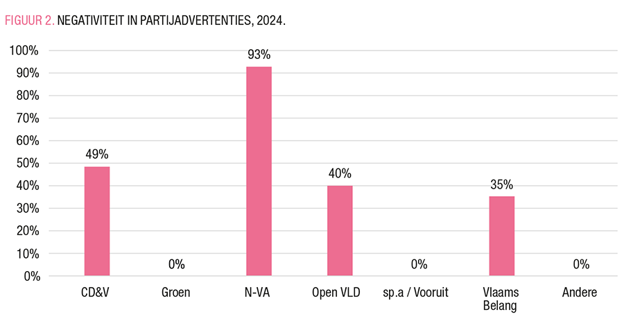 Vervolgens bekijken we de mate waarin de partijen een negatieve campagne voerden in hun advertenties. Het valt op dat Vlaams Belang, als zuivere oppositiepartij, niét de meest negatieve campagne voerde – althans niet in de advertenties in de geschreven pers. In de advertenties stond buiten de slogan (“Vlaanderen weer van ons”) vaak eenvoudigweg te weinig tekst om een ‘aanval’ uit af te leiden. De advertenties van N-VA bevatten wel bijna altijd een aanval, met name naar de federale regeringspartijen, met claims als “Onze Vlaamse welvaart wordt bedreigd door het federale beleid. We moeten een nieuwe paars-groene regering-De Croo onmogelijk maken”.
