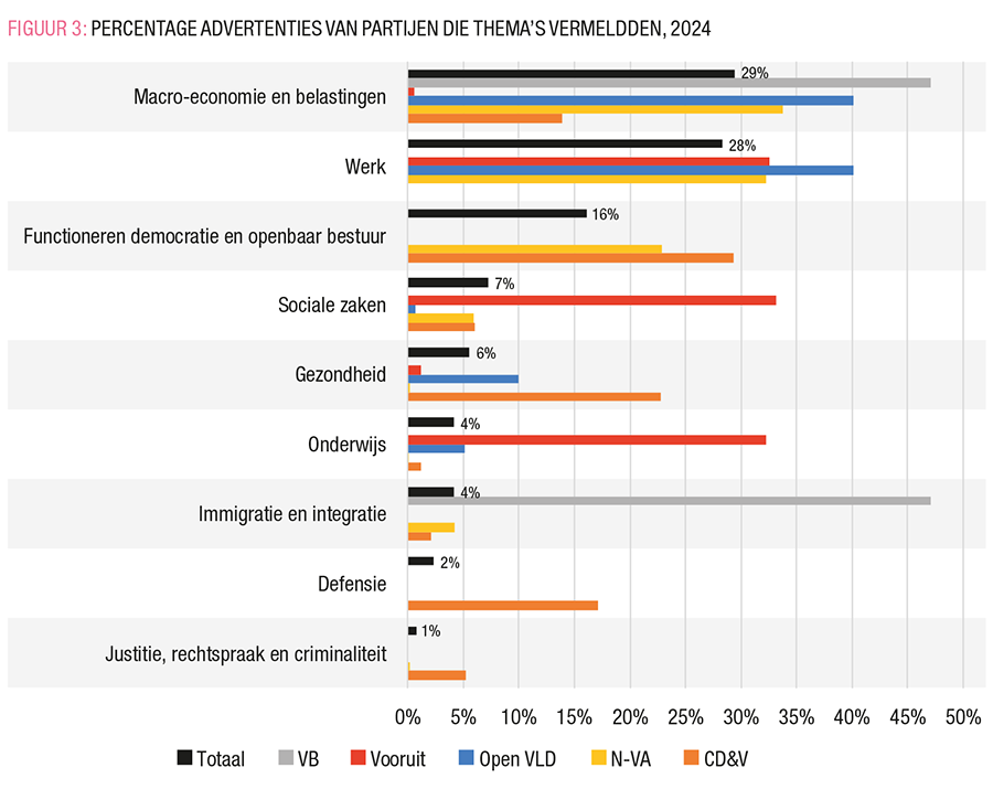 Algemeen bekeken domineerden economische thema’s de offline campagne: elke partij noemde macro-economie en/of werk in een substantieel aandeel van hun advertenties. De andere thema’s die genoemd worden, worden vaak door maar een paar partijen genoemd – en de partijen lijken zich erg op thema’s te focussen waar ze traditioneel sterk op staan. Open VLD had het meest uitgesproken een economische focus (40% werk, 40% macro-economie), en beperkte aandacht voor andere thema’s (zie verder), wat niet onlogisch is voor een liberale partij. N-VA combineerde een duidelijke economische focus (“Voor Vlaamse Welvaart”) met een communautaire insteek (23% aandacht voor functioneren democratie, waar communautaire kwesties onder vallen); Vooruit benadrukte sociale zaken (33%) en onderwijs (32%); Vlaams Belang immigratie (47%).