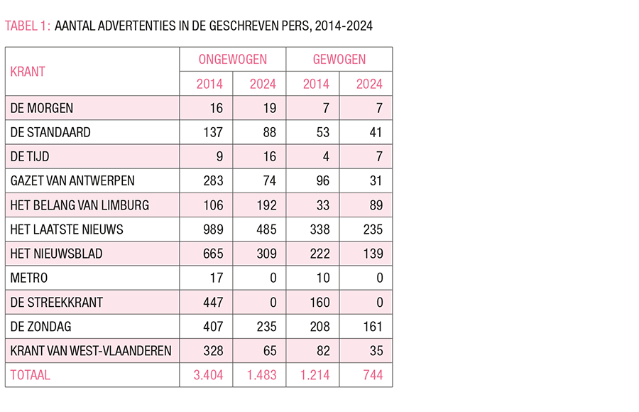 In deze bijdrage vergelijk ik daarom eerst de campagnes van 2014 en 2024, zodat we kunnen inschatten in welke mate het aantal advertenties in de geschreven pers inderdaad een duik heeft genomen. In het tweede luik sta ik stil bij de inhoud van de advertentiecampagne van 9 juni 2024. Welke boegbeelden werden naar voor geschoven? In welke mate was er sprake van een negatieve campagne? En welke thema’s werden naar voor geschoven door de partijen zelf?