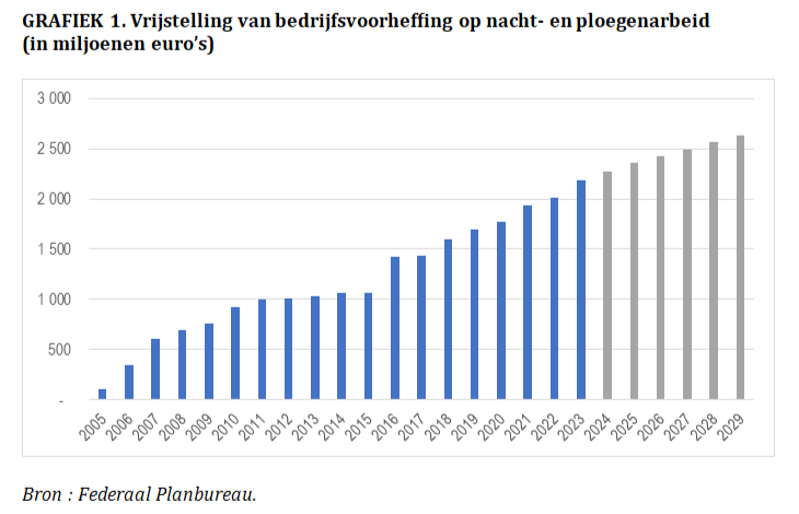 Tussen 2005 en 2023 is deze loonsubsidie gestegen van € 106 miljoen naar € 2,187 miljard. De aanpassing van de vrijstellingspercentages in 2016 heeft de omvang van deze steun aanzienlijk verhoogd: in slechts één jaar tijd is de subsidie met € 364 miljoen gestegen. Sindsdien groeit het totale bedrag van deze subsidie aan bedrijven elk jaar. Als de politiek ongewijzigd blijft, rekent het Planbureau op een jaarlijkse toename van ongeveer 3%, waardoor de € 2,5 miljard euro in 2028 zal worden overschreden. Gezien de aangekondigde maatregelen van de regering-De Wever op het gebied van nachtarbeid, zullen deze voorspellingen echter waarschijnlijk hoger uitvallen dan de werkelijke cijfers.