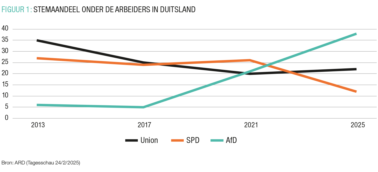 Tussen 2013 en 2021 kende de SPD een stabiel aandeel, met ongeveer een kwart van het electoraat afkomstig uit de arbeidersklasse – een resultaat dat overeenkomt met de uitslag van de tweede stem (de stem voor de deelstaatlijst). In 2025 behaalde de SPD echter slechts 12% van de arbeidersstemmen – een verlies van 54% vergeleken met de voorgaande verkiezingen van september 2021. Dit wijst erop dat het kernelectoraat zich massaal heeft afgekeerd van de partij, met verregaande electorale gevolgen zoals FIGUUR 1 laat zien. Het immobilisme binnen de ‘Ampel’-coalitie van groenen, liberalen en de SPD als leidende partij, de inflatie, de verwaarloosde infrastructuur, het einde van de goedkope energie en de slabakkende Duitse economie, met massale afdankingen in de industrie tot gevolg, gaven de genadeslag. In de recente verkiezingen in Duitsland hebben de arbeiders zich massaal van de SPD afgekeerd.