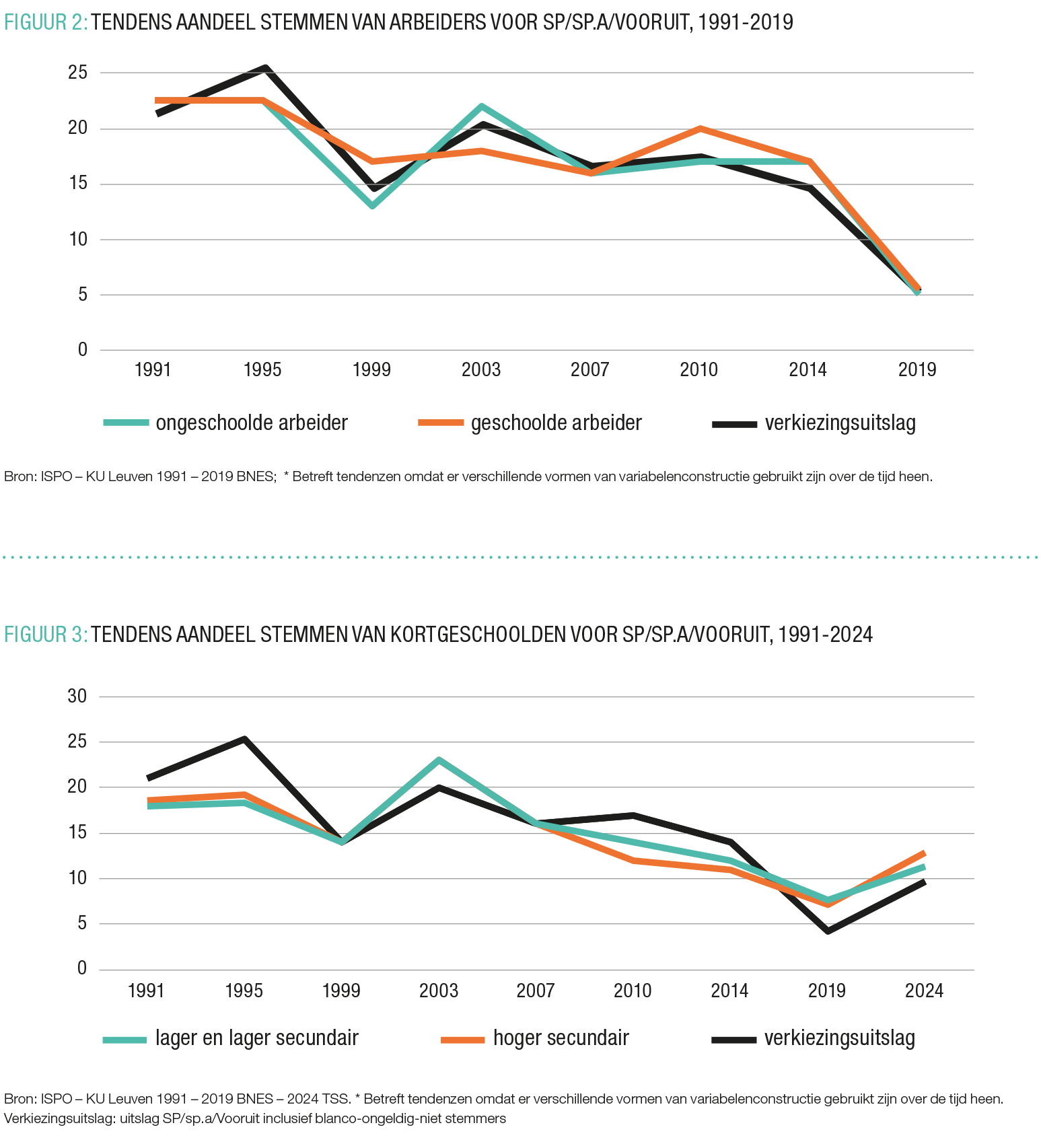 Hoe verhoudt deze internationale trend zich tot de relatie tussen arbeiders en kortgeschoolden en SP/sp.a/Vooruit in Vlaanderen? FIGUUR 2 en FIGUUR 3 illustreren de tendensen van deze kiezersgroepen sinds respectievelijk 1991 voor de arbeiders (geschoolde en ongeschoolde arbeid; zie FIGUUR 2), en voor de kortgeschoolden (lager of lager middelbaar en hoger middelbaar; zie FIGUUR 3).