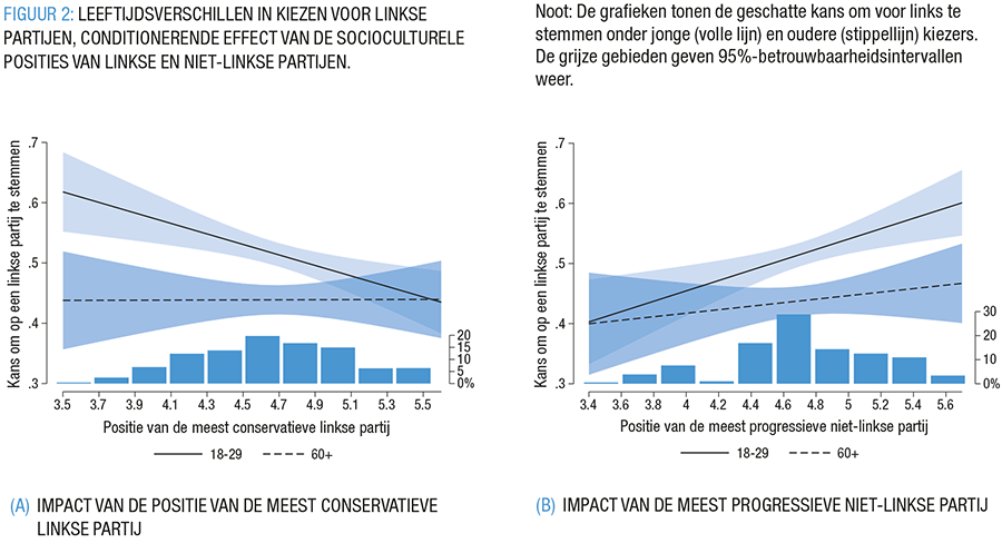 Onze studie, waarvan hier de belangrijkste resultaten zijn samengevat, maakt gebruik van verschillende benaderingen en datasets om leeftijdsverschillen in stemmen voor linkse partijen te onderzoeken. Elk van die testen leidt tot dezelfde conclusie: of jongeren meer of minder op linkse partijen stemmen dan oudere kiezers hangt af van de positie die linkse en niet-linkse partijen innemen op de sociaal-culturele dimensie. Jongere kiezers geven de voorkeur aan sociaal-progressieve partijen. Bijgevolg zien we dat de leeftijdsverschillen in steun voor linkse partijen groter zijn in contexten waar linkse partijen veel progressiever zijn dan rechtse partijen.