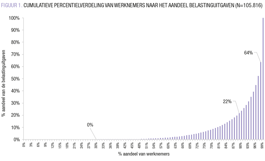 FIGUUR 1 toont ten eerste dat 30% van de werknemers geen gebruik maakt van (para)fiscale subsidies omdat ze geen aanvullend pensioen opbouwen. Ten tweede toont de figuur dat 22% van de 2,1 miljard euro die wordt gespendeerd aan (para)fiscale subsidies ten goede komt aan 90% van de werknemers, terwijl 78% naar 10% van de werknemers vloeit. Sterker, 64% van de uitgaven gaat naar 99% van de werknemers, terwijl 36% naar slechts 1% van de werknemers vloeit.