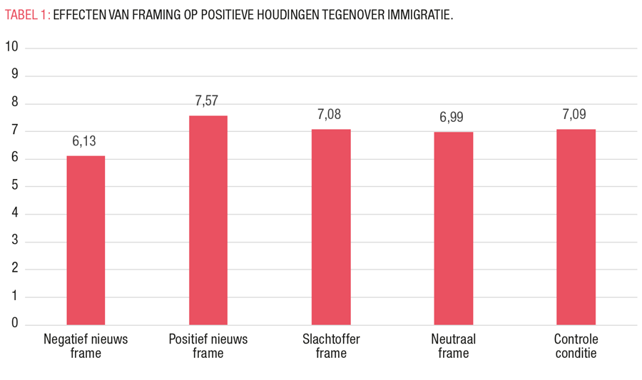 De resultaten bevestigen grotendeels onze theoretische verwachtingen: blootstelling aan negatieve frames leidden tot significant negatievere attitudes vergeleken met blootstelling aan positieve of neutrale berichtgeving (TABEL 1). Het slachtofferframe had weinig invloed en week niet significant af van een nieuwsverhaal met neutraal frame. De tweede verwachting werd wel verworpen: er werd geen rechtstreeks effect gevonden van de gebruikte term (‘vluchteling’, ‘immigrant’, ‘asielzoeker’) op de houding van de deelnemers (TABEL 2).